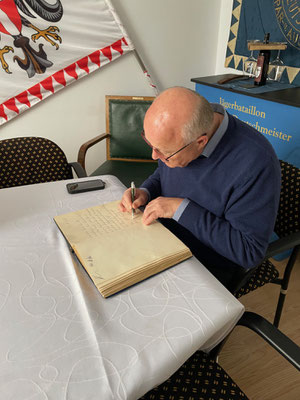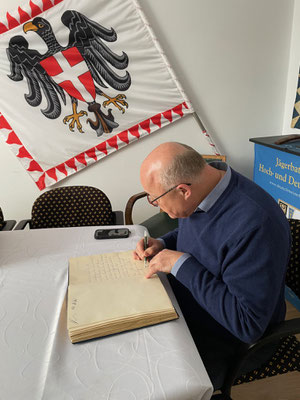 Nach einer kurzen Erfrischung wurde Oberbürgermeister Glatthaar im Vereinsheim des Unterstützungsvereins Hoch- und Deutschmeister herzlich empfangen. Dort bat man ihn, sich in das Ehrenbuch des Vereins einzutragen – ein Zeichen großer Wertschätzung und Verbundenheit.